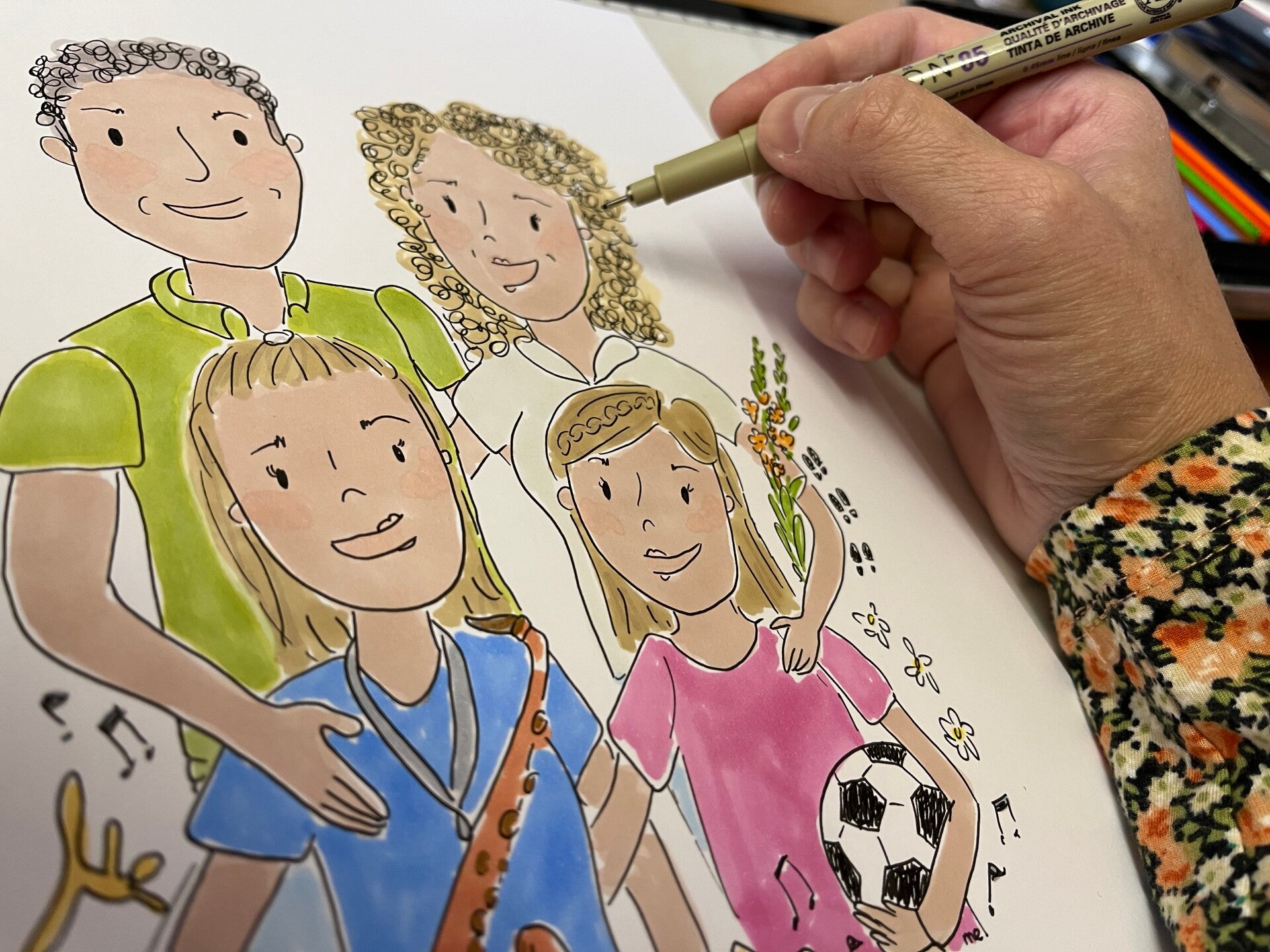 Ik teken gezinnen, koppels, kinderen en huisdieren in een prentenboekachtige stijl vol warmte. Elk portret zit boordevol persoonlijke details die écht bij jullie passen – van favoriete kleding en hobby’s tot een plek of herinnering die belangrijk is.