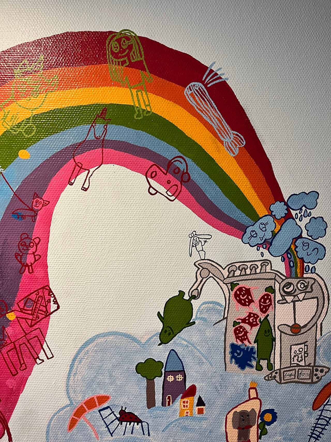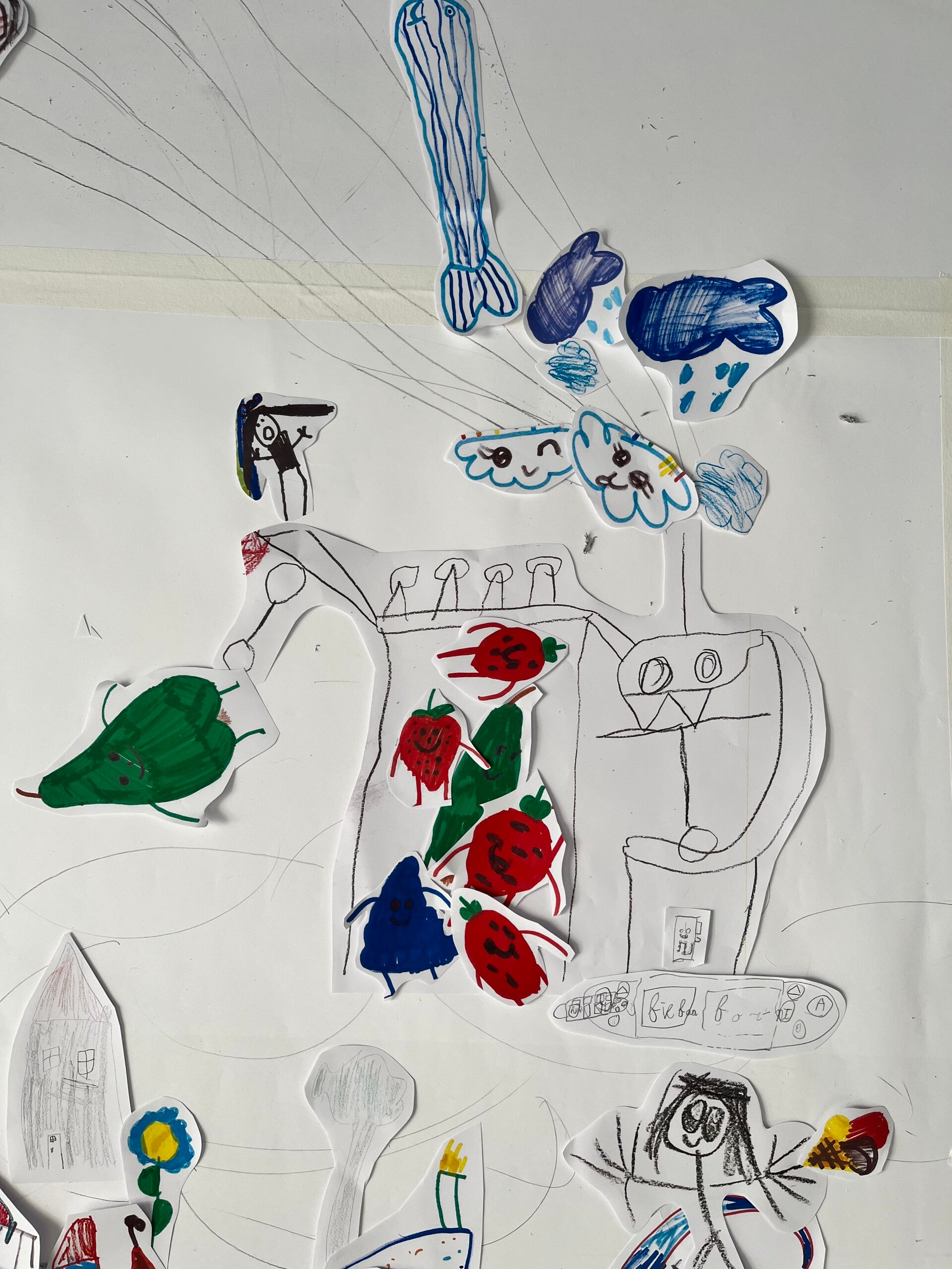 De schildering is volledig opgebouwd uit de ingebrachte tekeningen van de kinderen. De aardbei van het ene kind werd onderdeel van de machine van een ander. Zo groeide alles samen tot één geheel.